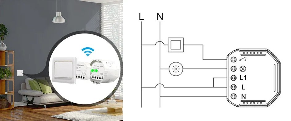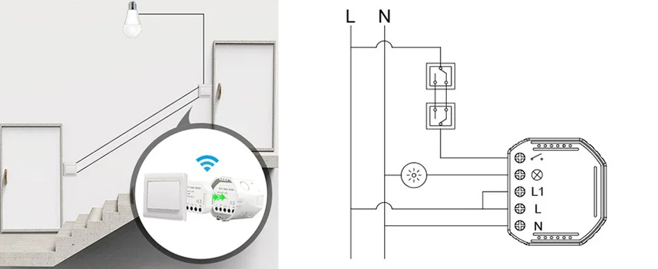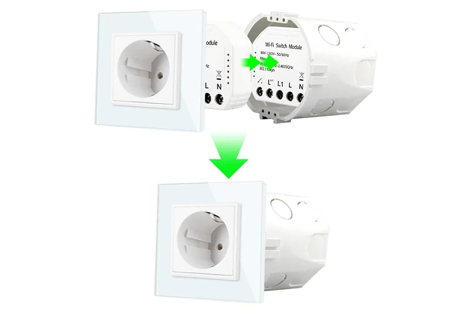 - التركيب والتشغيل: ضع الوحدة المدمجة داخل صندوق التوصيل خلف المفتاح وأعد الطاقة.