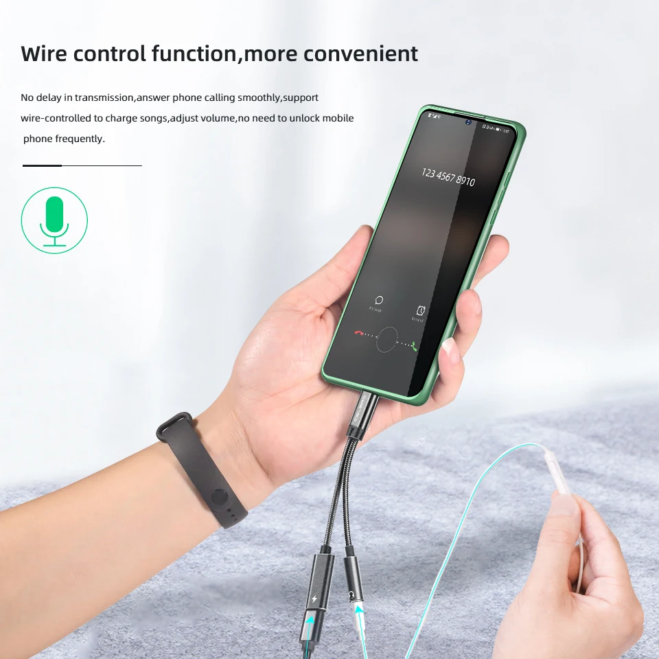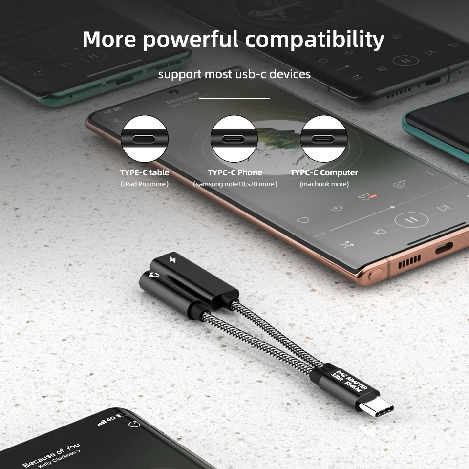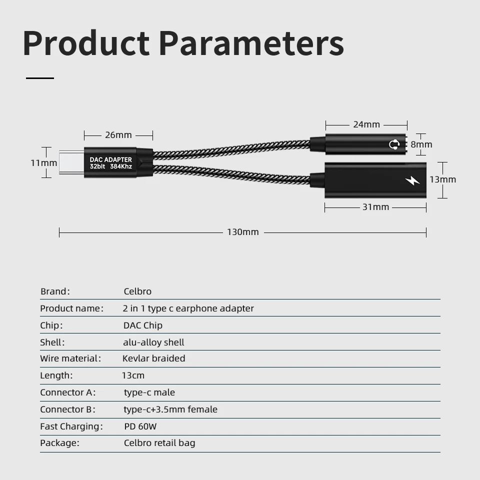 1. Interface: USB Type C (Male) to 3.5mm Earphone jack (Female) + Type C Charging Port (Female)