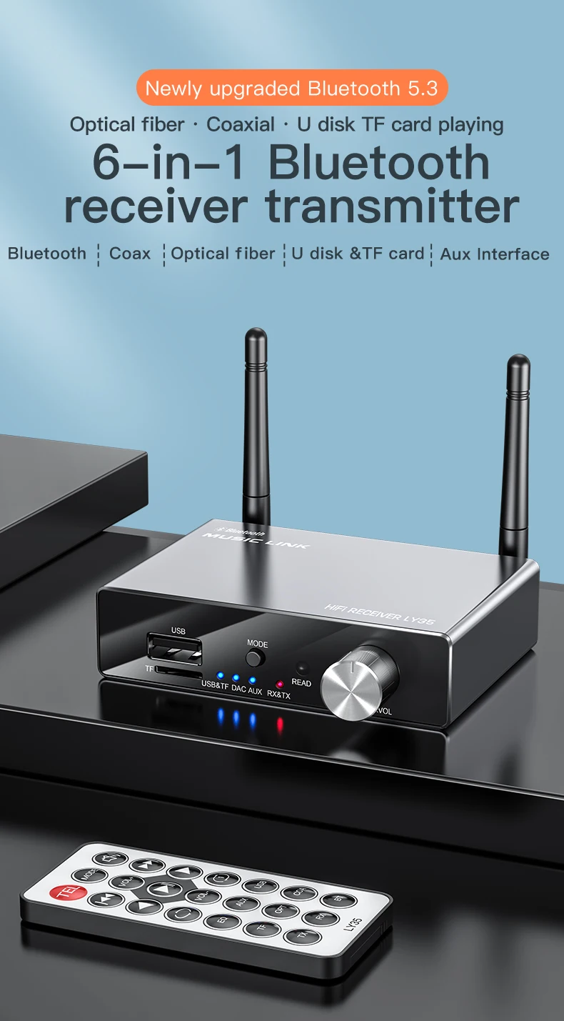 - 6-in-1 Functionality: Bluetooth RX/TX, DAC, USB/TF Play, Remote Control.