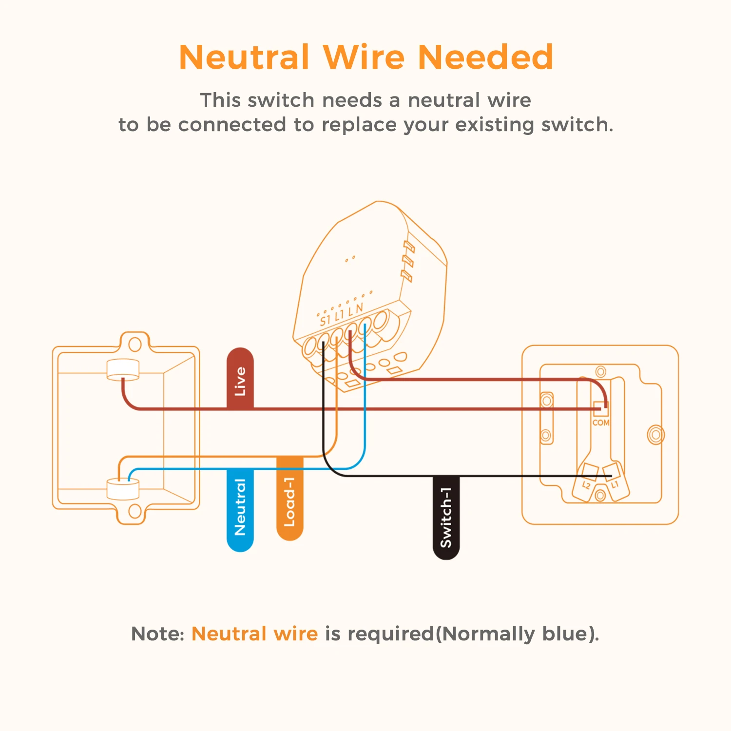 - Wiring: A Neutral wire is required in your wall switch box. The module has inputs for Live (L), Neutral (N), Load (L1), and your physical switch (S1).