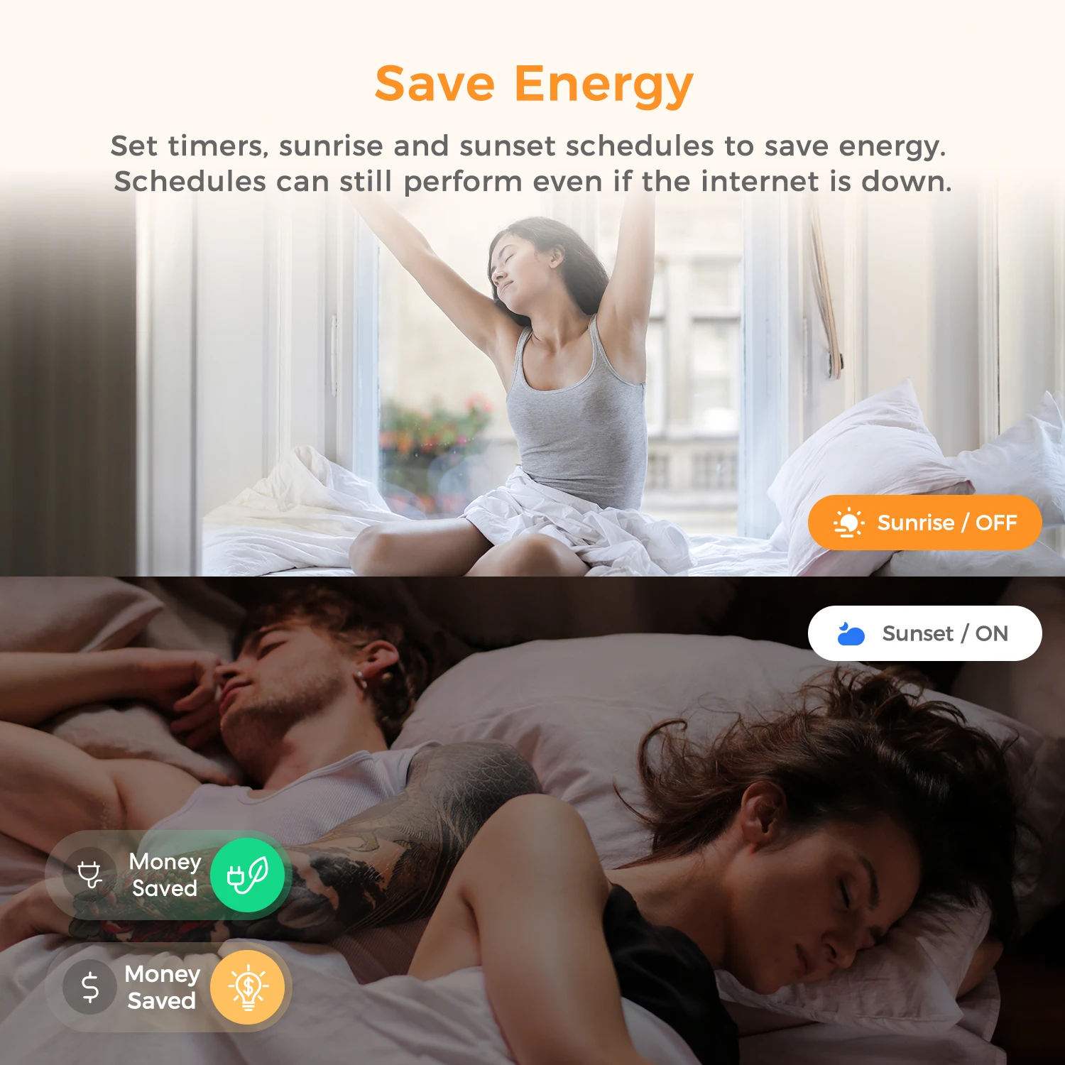 Set timers, sunrise and sunset schedules to save energy. Schedules can still perform even if the internet is down.