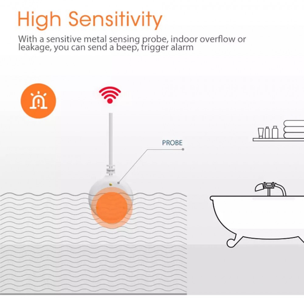 A water immersion sensor that can detect water leakage in the environment in real time. When water immersion is detected, the detector will send an alarm signal to the host and report the information to the user's mobile phone.